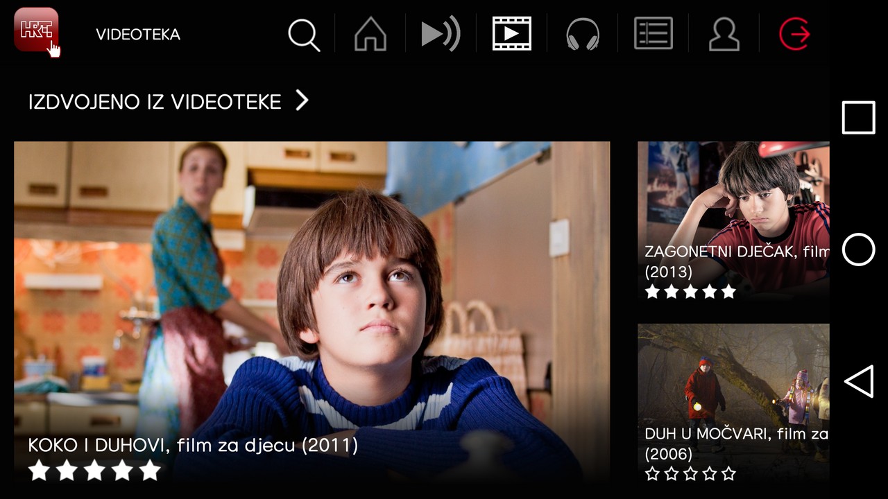 Na HRTi aplikaciji je dostupna i videoteka sa besplatnim sadržajima – mali izbor, ali obećavajući – u njoj možete trenutno besplatno pogledati filmove Koko i duhovi, Zagonetni dječak, Ljubav ili smrt, Duh u močvari, Sonja i bik, Broj 55, Ispod crte, Majstori, Tri muškarca Melite Žganjer i Kauboji kao i nekoliko serija, dokumetaraca, snimke informativnih i drugih HRT emisija.