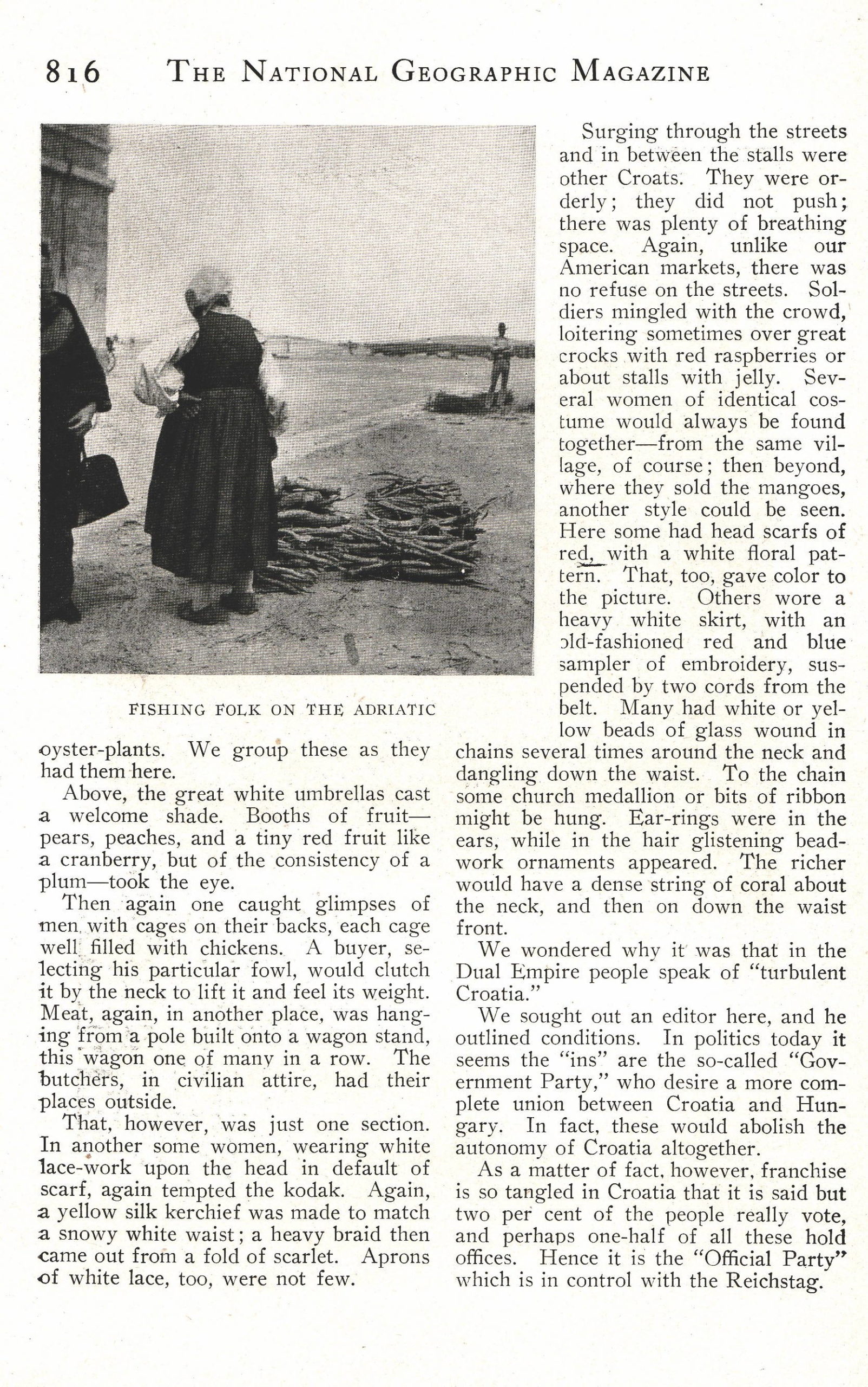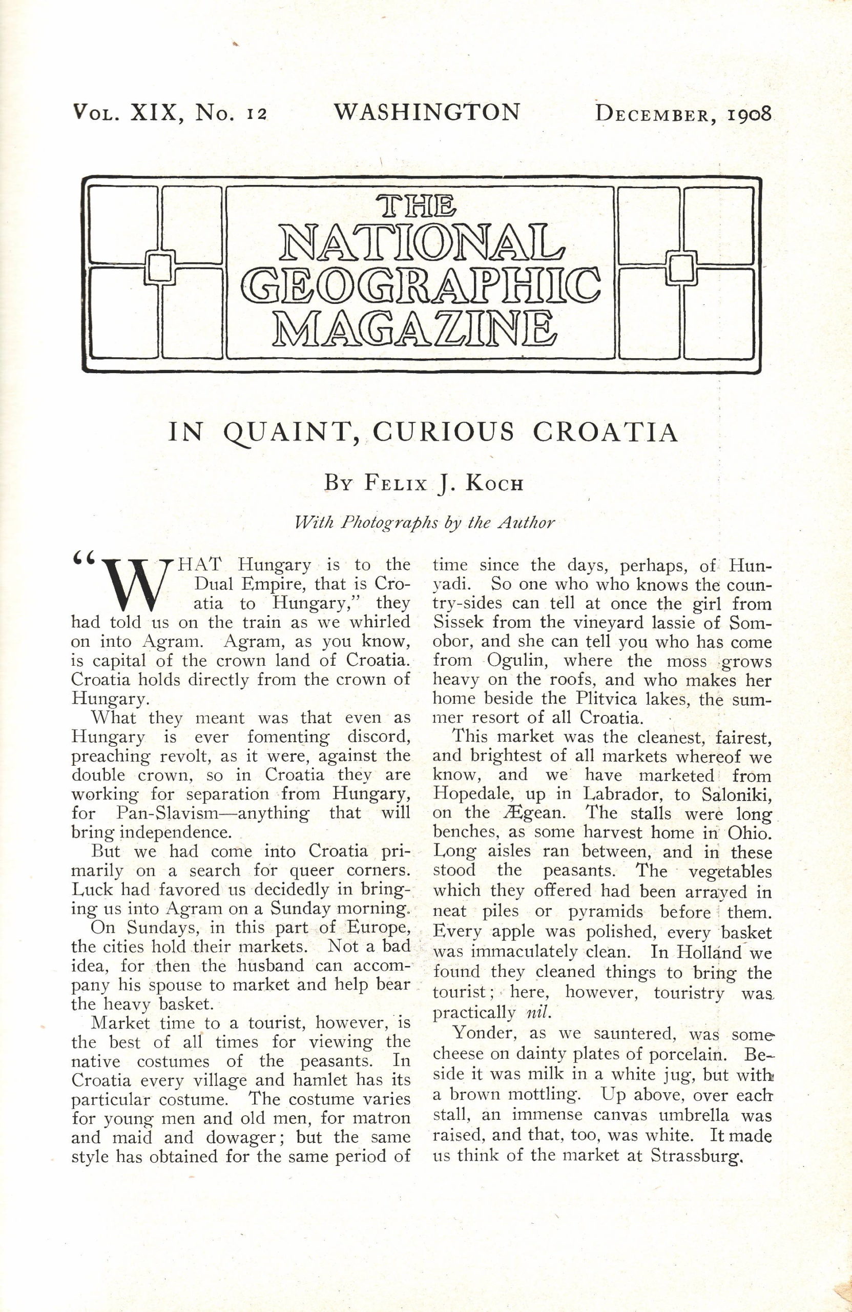 National Geographic je svom časopisu iz 1908. godine u broju za mjesec prosinac objavio reportažu iz Hrvatske pod nazivom “U neobičnoj, zanimljivoj Hrvatskoj”. U to vrijeme, službeni naziv Hrvatske je bio Trojedna Kraljevina Hrvatska, Slavonija i Dalmacija ili neslužbenije Trojednica, a bila je samosvojno kraljevstvo unutar Austro-Ugarske Monarhije.